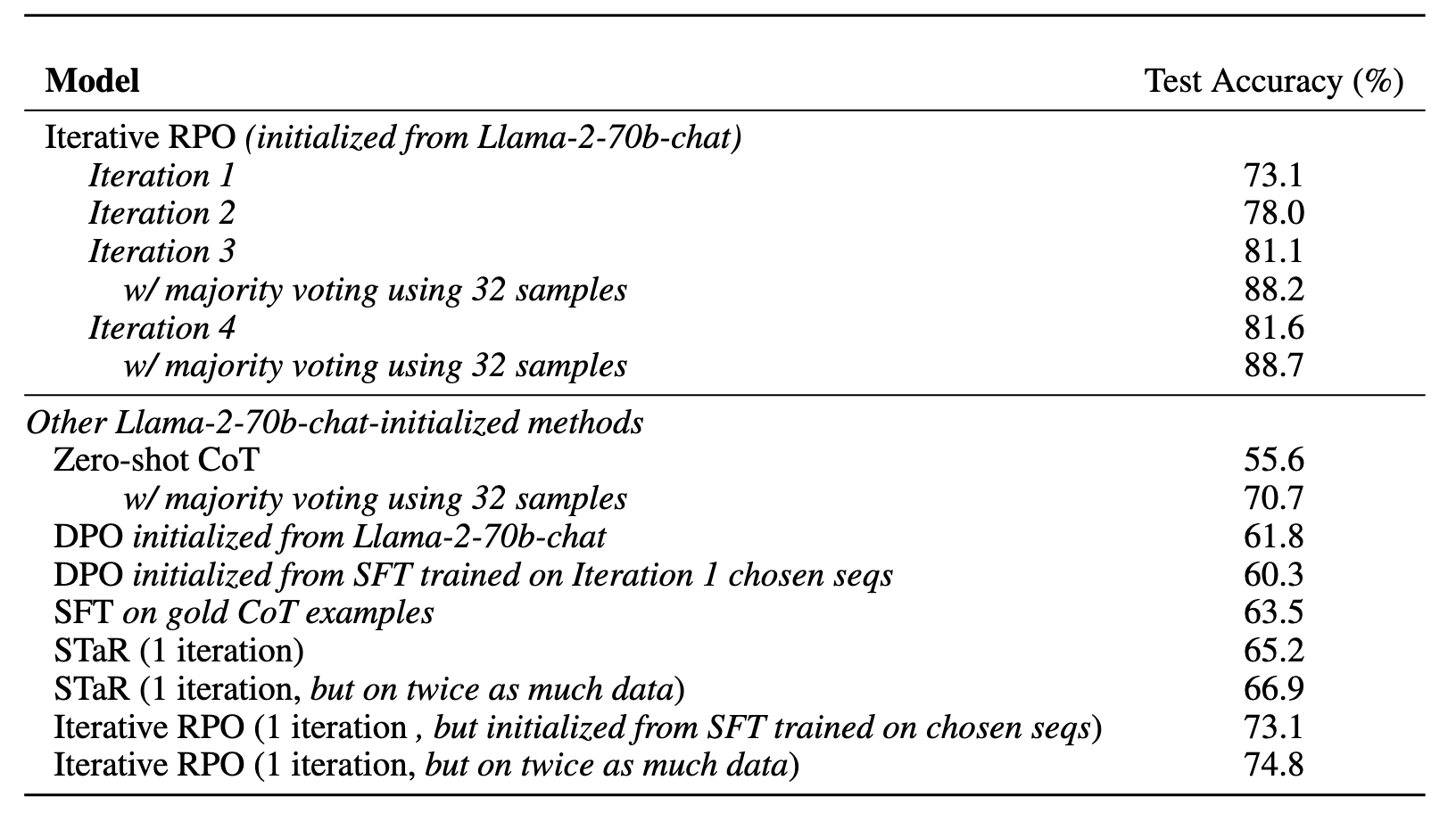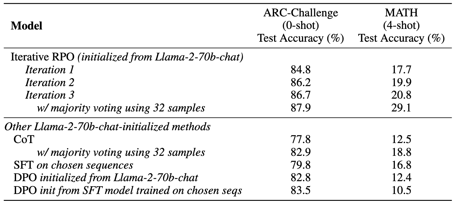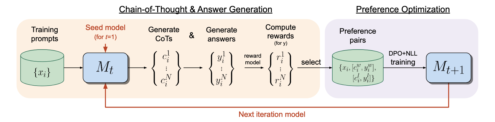 [12] Pang, Richard Yuanzhe, Weizhe Yuan, Kyunghyun Cho, He He, Sainbayar Sukhbaatar, and Jason Weston. “Iterative Reasoning Preference Optimization.” arXiv, 2024.