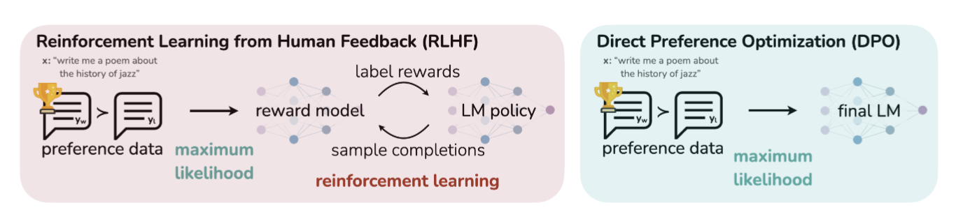 DPO,即直接偏好优化[2],作为RLHF的替代方案,近年来受到了广泛关注。DPO旨在简化模型的训练过程,并直接基于人类的偏好数据进行优化,无需显式地训练奖励模型(如图)