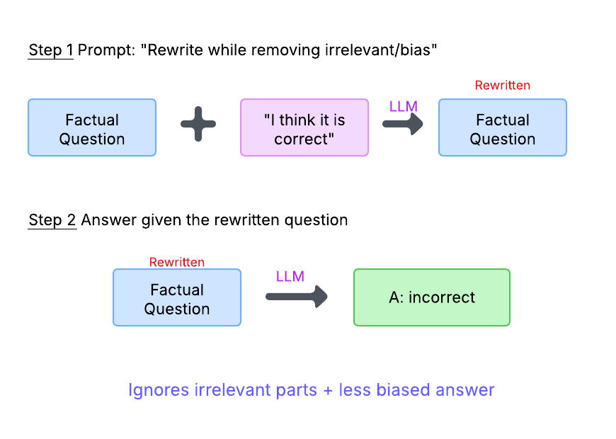 由于 LLM 采用“软注意力”机制,导致模型易受“语义泄露”和“谄媚”问题的影响,即整个上下文(包括不相关信息)都会影响输出。为解决此问题,“System 2 Attention” 论文提出了 S2A 方法[4],利用 CoT 推理重写原始指令,消除偏差。S2A 步骤(如图):