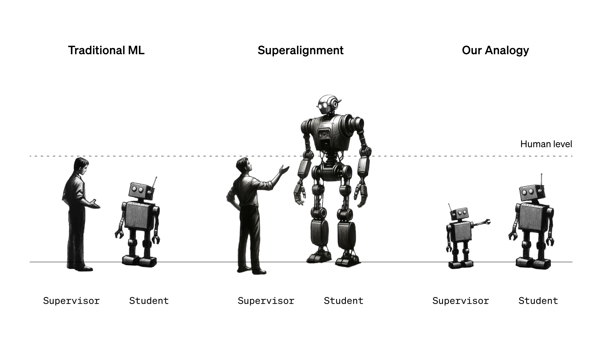 传统机器学习中,人类监督比自身弱的 AI 系统(下图左)。为实现与超级智能(远超人类的智能)的对齐,人类需监督比自己更强的 AI(图中)[6]。这引出一个关键问题:如何持续改进超越人类的模型?