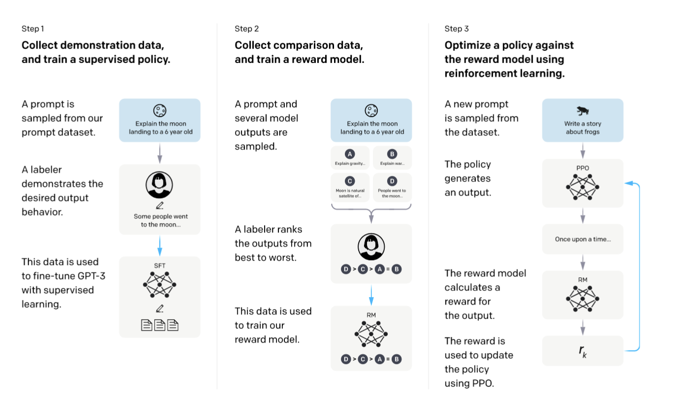 InstructGPT 是在 2022 年提出的一种语言模型优化方法[1],它结合了监督学习和基于人类反馈的强化学习(RLHF),比单纯的监督微调更为先进。这种方法包含三个关键步骤(如图):