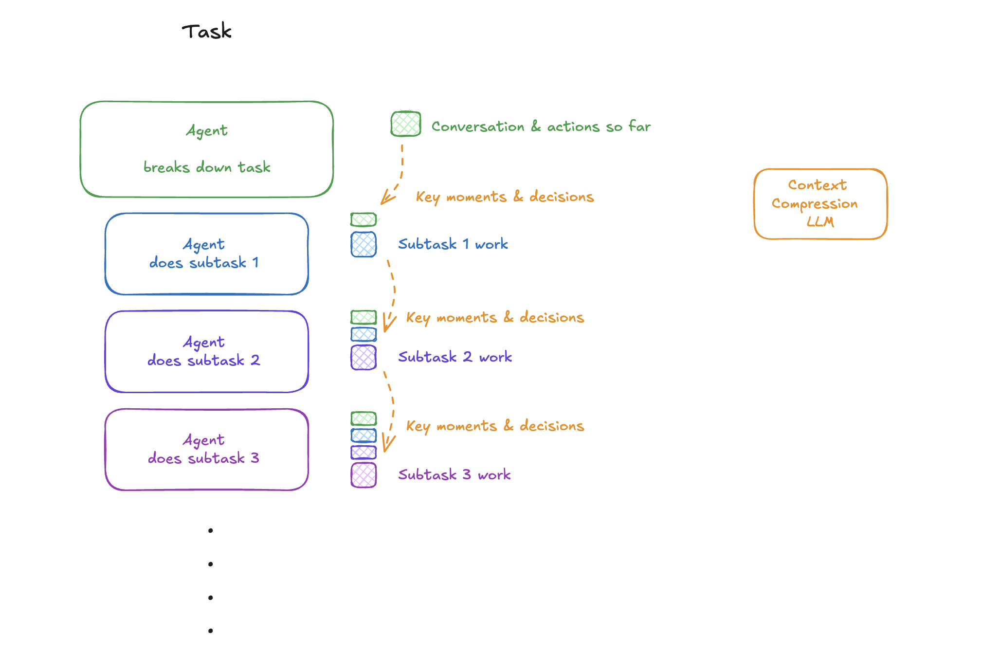In Cognition’s post Don’t Build Multi-Agents, tasks are broken down and delegated to sub-agents. Summarization is used as a form of information handoff: before passing work to Sub-Agent 1, the main agent generates a summary. Sub-Agent 1 reads this compressed version and can start immediately, because it doesn’t need the full raw context to understand the task.